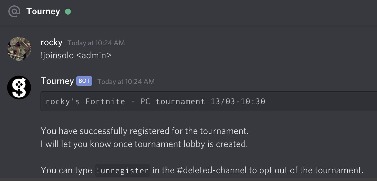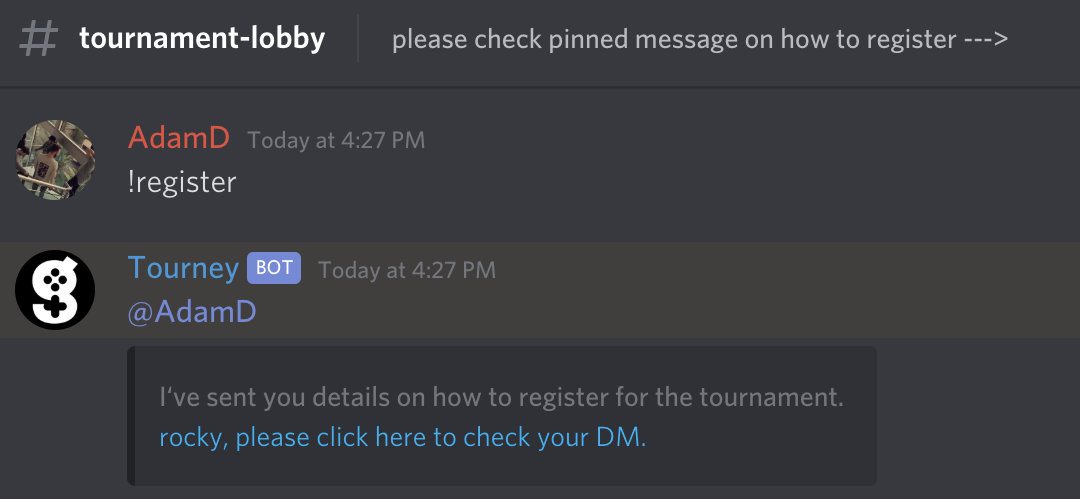 Step 3 - Find an active tournament and type !register in the lobby channel to register for the tournament.